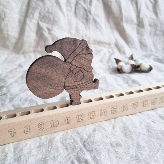 Handgemachter Adventskalender / Adventsleiste aus Holz: Mit Weihnachtsmann in Walnuss (groß)
