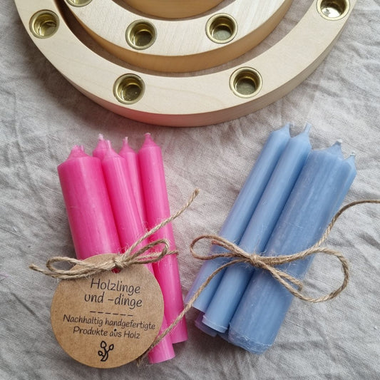 In unseren Kerzensets steckt alles, was du für den Geburtstagsring brauchst: ein großes Lebenslicht für die Mitte und zehn passende kleine Kerzen für die äußeren Ringe.