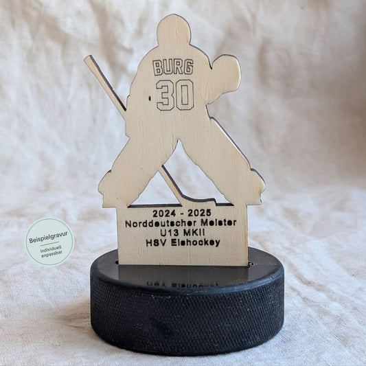 Eishockey Pokal „Goalie“ – personalisierbar aus Holz & echtem Puck