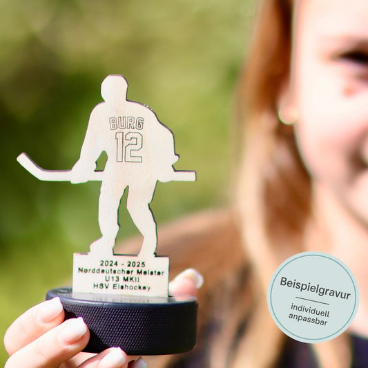Holzpokal auf echtem Eishockey-Puck – personalisierbar
